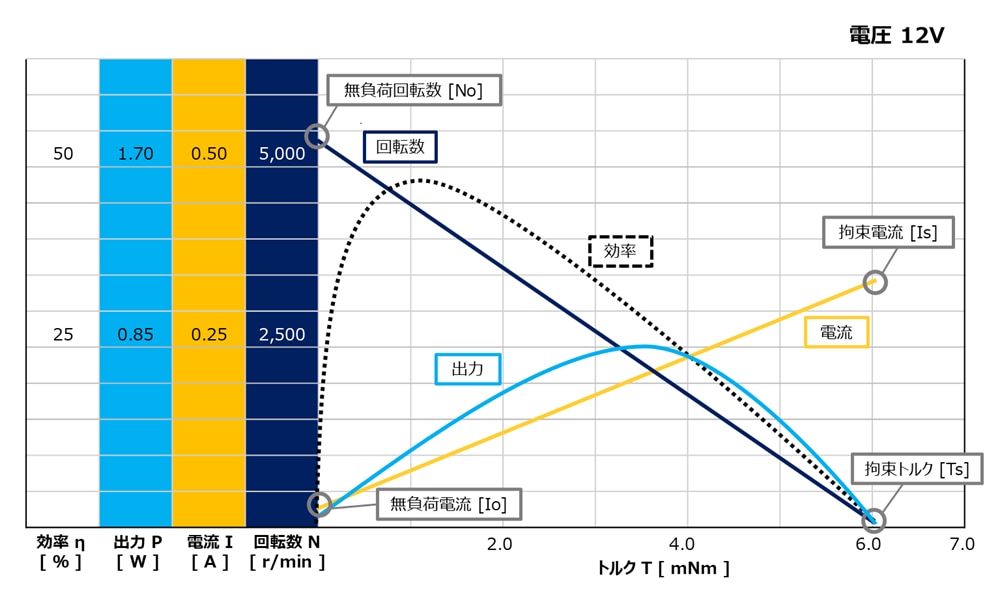 ブラシ付モータの性能線図には、出力効率拘束トルク [Ts] 拘束電流 [Is] といった用語が記載されていることもありますが、基本的な見方はブラシレスモータの場合と変わりません。