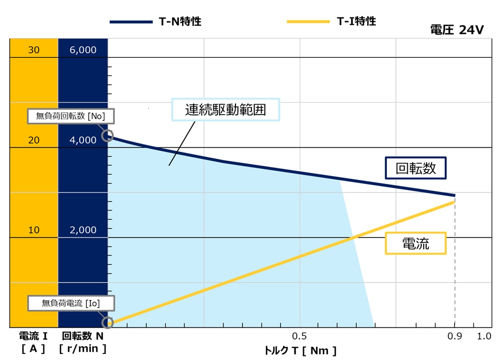 また、回転数は無負荷(トルクが0)時に最大となり、その際の回転数を無負荷回転数 [No] と呼びます。