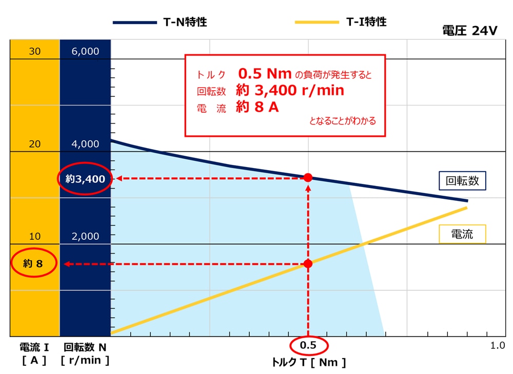 上の例では、トルク値から回転数と電流の値を読み取りましたが、回転数や電流値を起点にその他の値を読み取ることも可能です。例えば「回転数が3,400r/min」の場合、「約0.5Nmのトルクを発揮でき、その際の電流値は約8Aになる」という見方もできます。