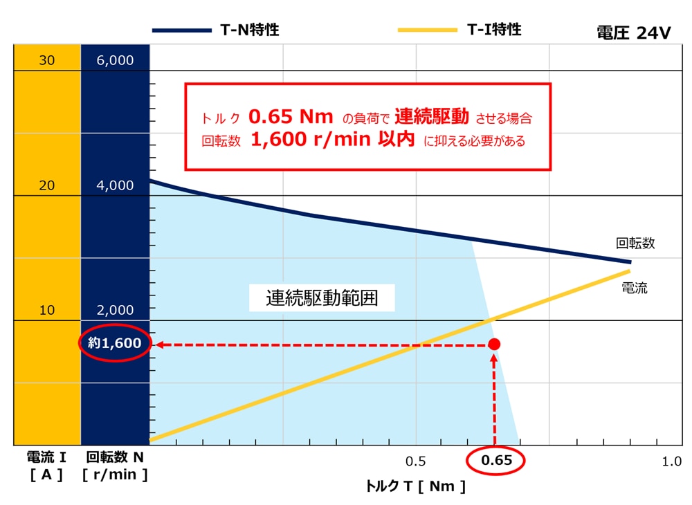 2. 縦軸 回転数 N の値を見ると、連続駆動時は 1,600r/min 以内に抑える必要があることがわかる(それに伴い、モータに印加する電圧も下げる必要がある)